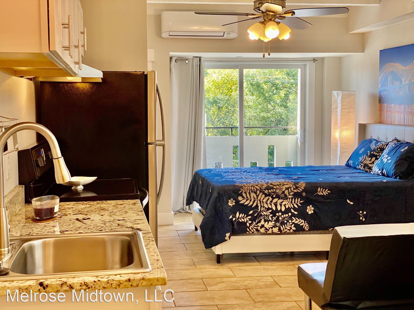 The Kira - Dine, play, and relax in the Kira's open floor plan. The Kira models, like all our apartments, were just renovated. They feature modern gleaming tile, marble bathrooms, lots of storage, and a large bedroom. A compact and complete kitchen offers granite countertops, stainless appliances, dishwasher, disposal, washer and dryer. The Kira also features a pass-through window between kitchen and dining area or a kitchen island. Some even have walk in closets. Unusual for its size, the Kira's bedroom has an “en suite” full bath: tub, commode, vanity, vanity mirror, and large closet. New ceiling fans, new flooring, and sparkling clean finishes keep your space cozy and fresh day or night. All Kira (South) apartments offer large windows and streaming sunlight year-round. For extra convenience, all Kira units are just a few steps from the building elevators. Are you ready to move? We're ready to meet you! The Melrose won the 2019-2022 award for Best Apartment Community in all of Memphis. Take a tour today and find out why. Prices are higher on the north side of the Melrose and on higher floors (including penthouse).